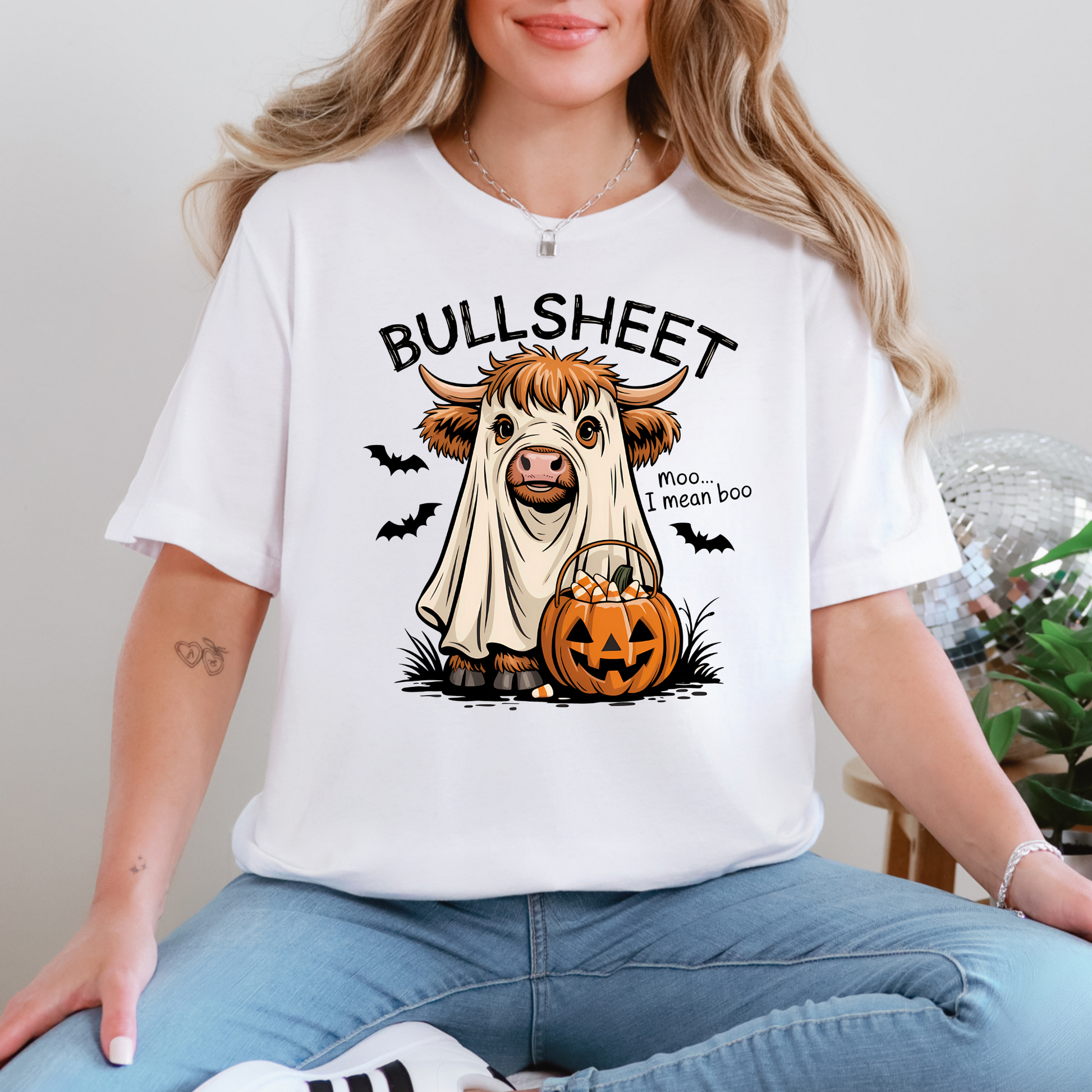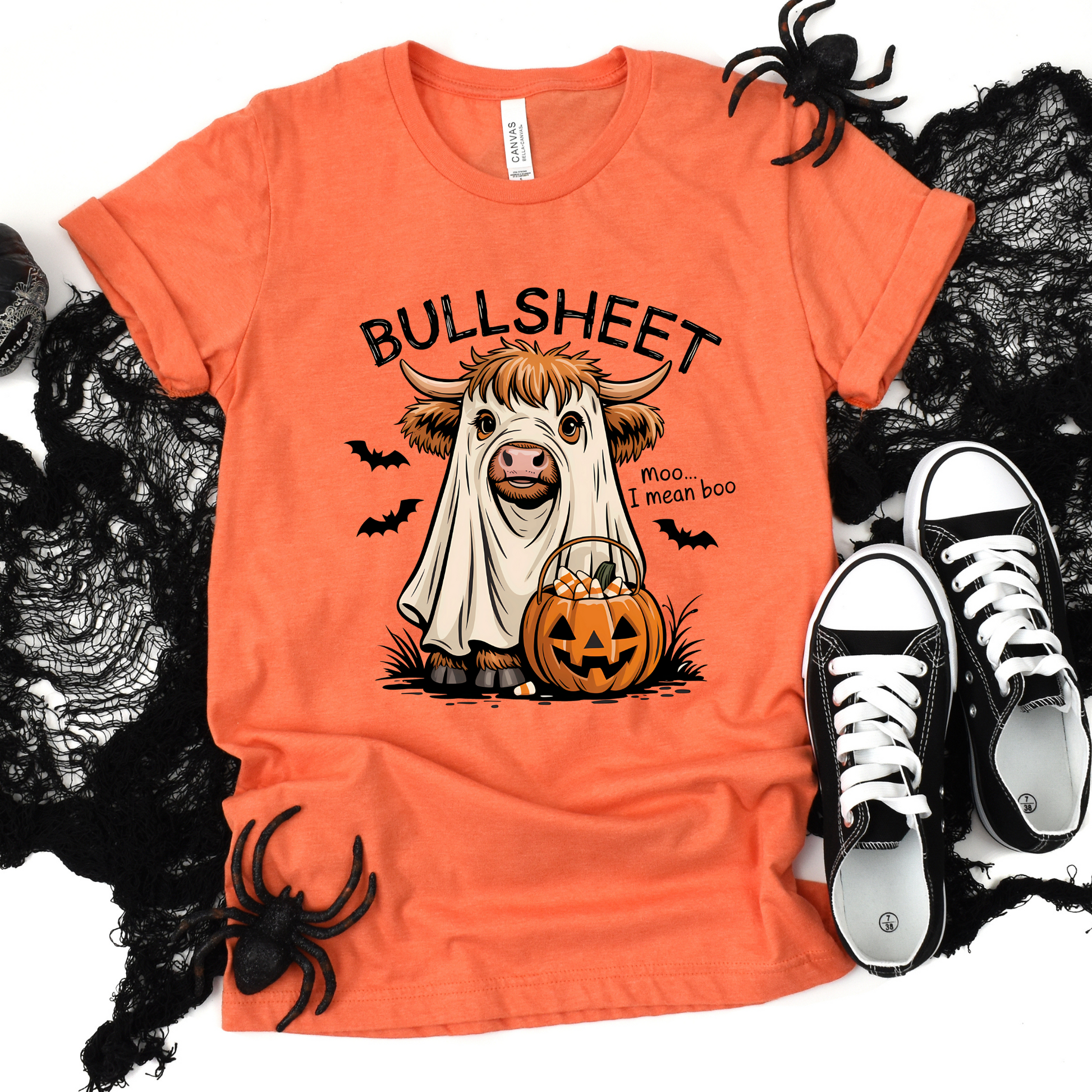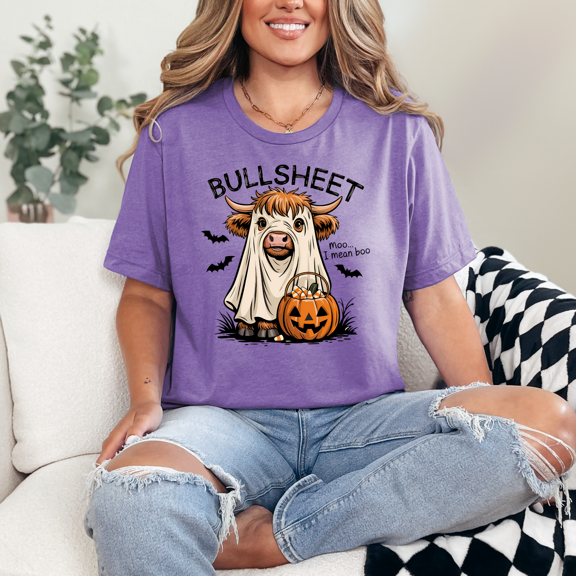 Add some humor to your spooky season with our 'Bullsheets' Halloween tee! Featuring an adorable Highland cow dressed as a ghost with the punny line 'moo… I mean boo,' this soft and comfy shirt is perfect for festive fun all October long.