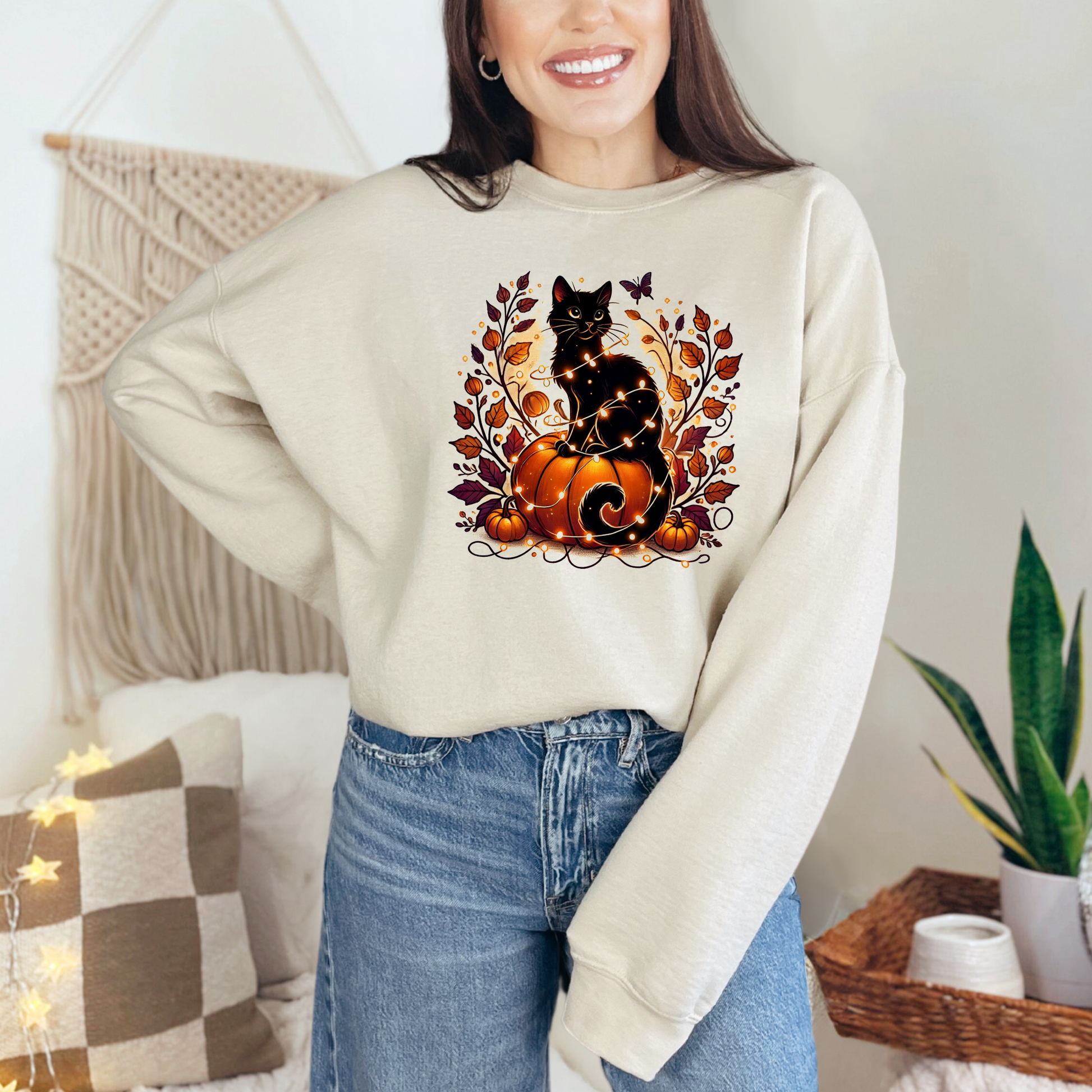 Cozy up for spooky season with this adorable sweatshirt featuring a black cat perched on a pumpkin, surrounded by autumn leaves and twinkling lights. Perfect for fall vibes, Halloween lovers, and anyone who wants to stay warm in style. Soft, comfy, and ready for all your seasonal adventures!