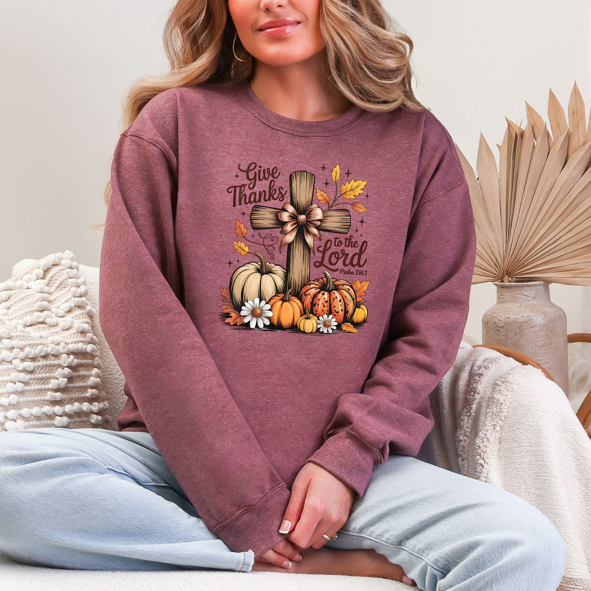 Celebrate faith and gratitude in cozy fall style with this Give Thanks to the Lord sweatshirt. Featuring a rustic cross surrounded by pumpkins, autumn leaves, and scripture from Psalm 136:1, this design is perfect for Thanksgiving and beyond. Made with soft, premium fabric for all-day comfort and a relaxed fit.