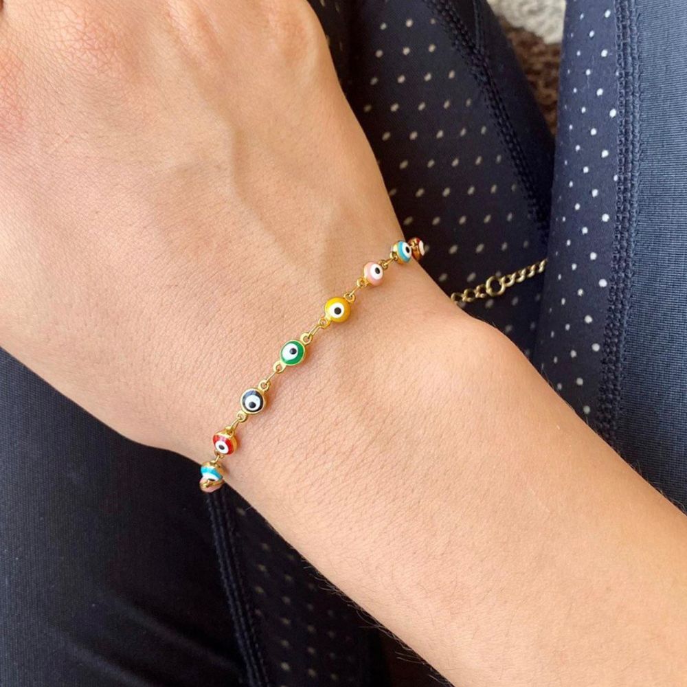 This bracelet's evil eye charm is encircled by various colors that are believed to offer protection from the evil eye and curses.