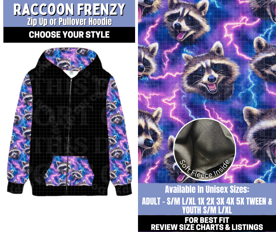 Preorder! Closes 10/30. ETA Jan. Raccoon Frenzy Zip-Up or Pullover Hoodie