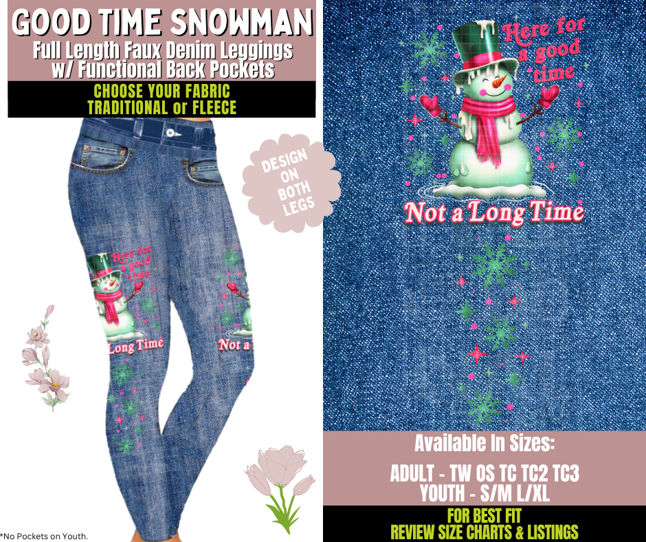 Preorder! Closes 10/8. ETA Dec. Good Time Snowman Faux Denim Leggings w/ Side Leg Designs Choose Fleece or Traditional