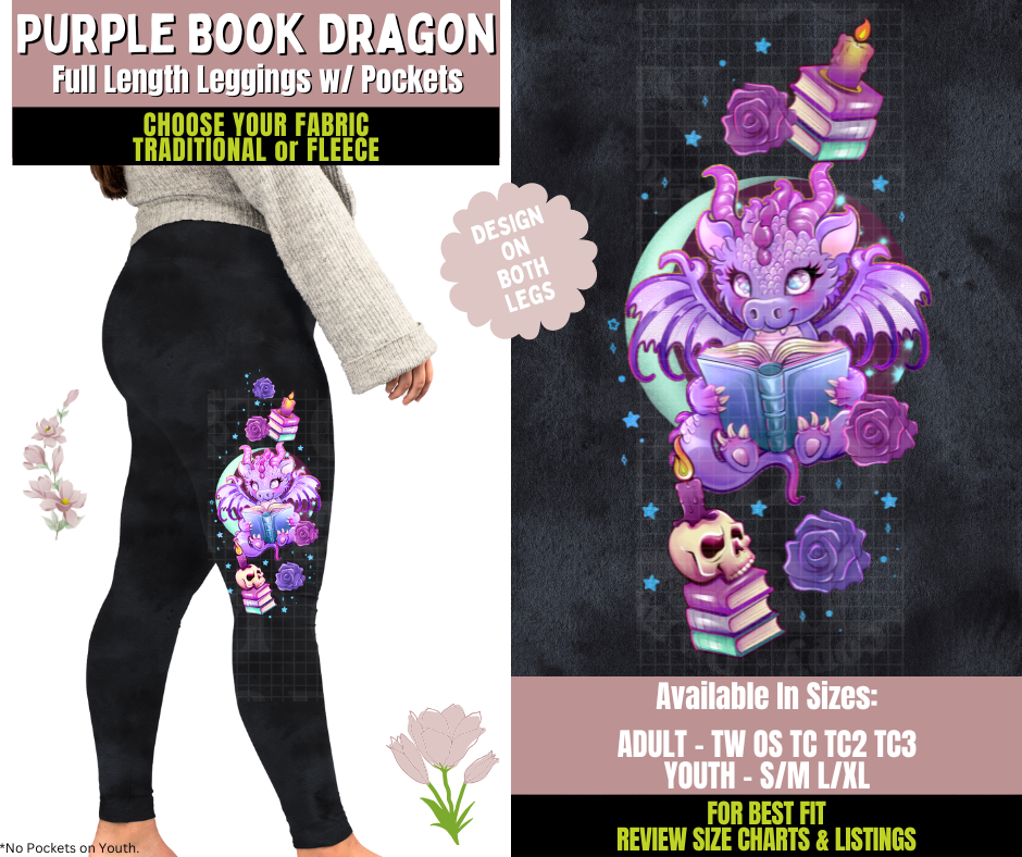 Preorder! Closes 10/8. ETA Dec. Purple Book Dragon Watercolor Leggings w/ Side Leg Designs Choose Fleece or Traditional