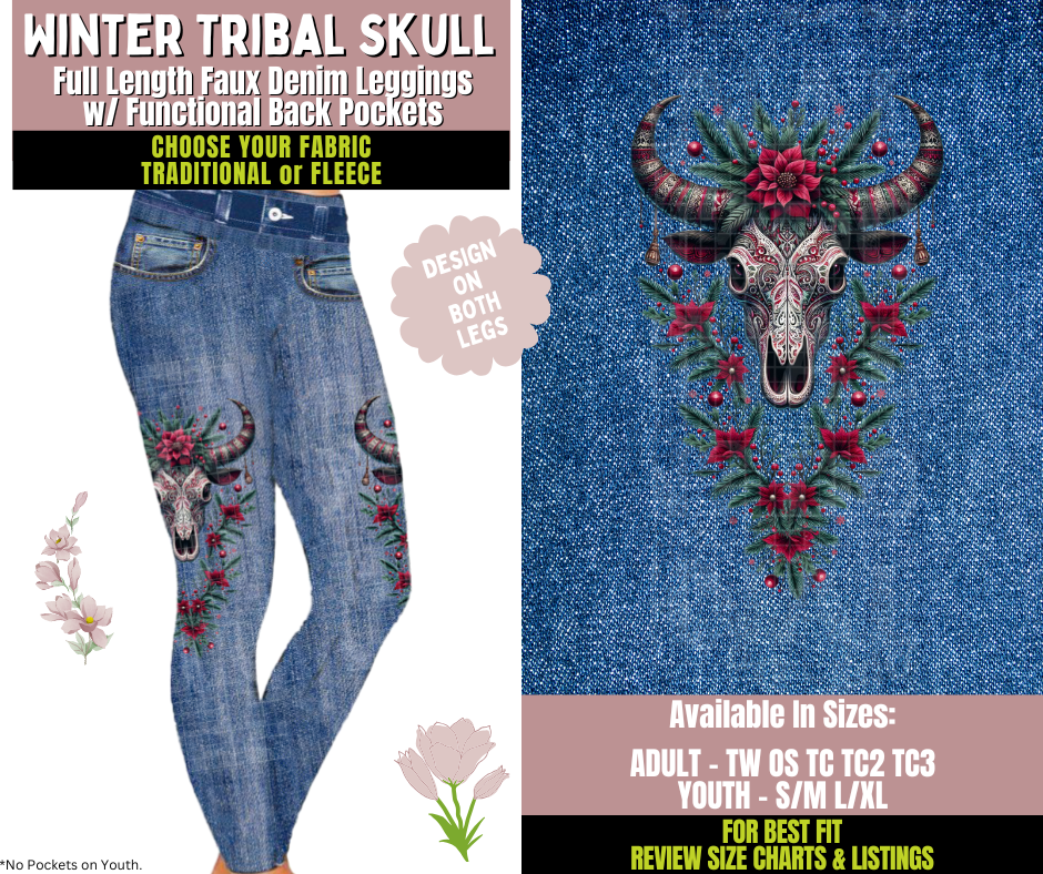 Preorder! Closes 10/8. ETA Dec. Winter Tribal Skull Leggings w/ Side Leg Designs Choose Fleece or Traditional
