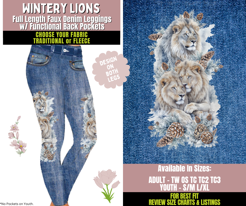 Preorder! Closes 10/8. ETA Dec. Wintery Lions Leggings w/ Side Leg Designs Choose Fleece or Traditional