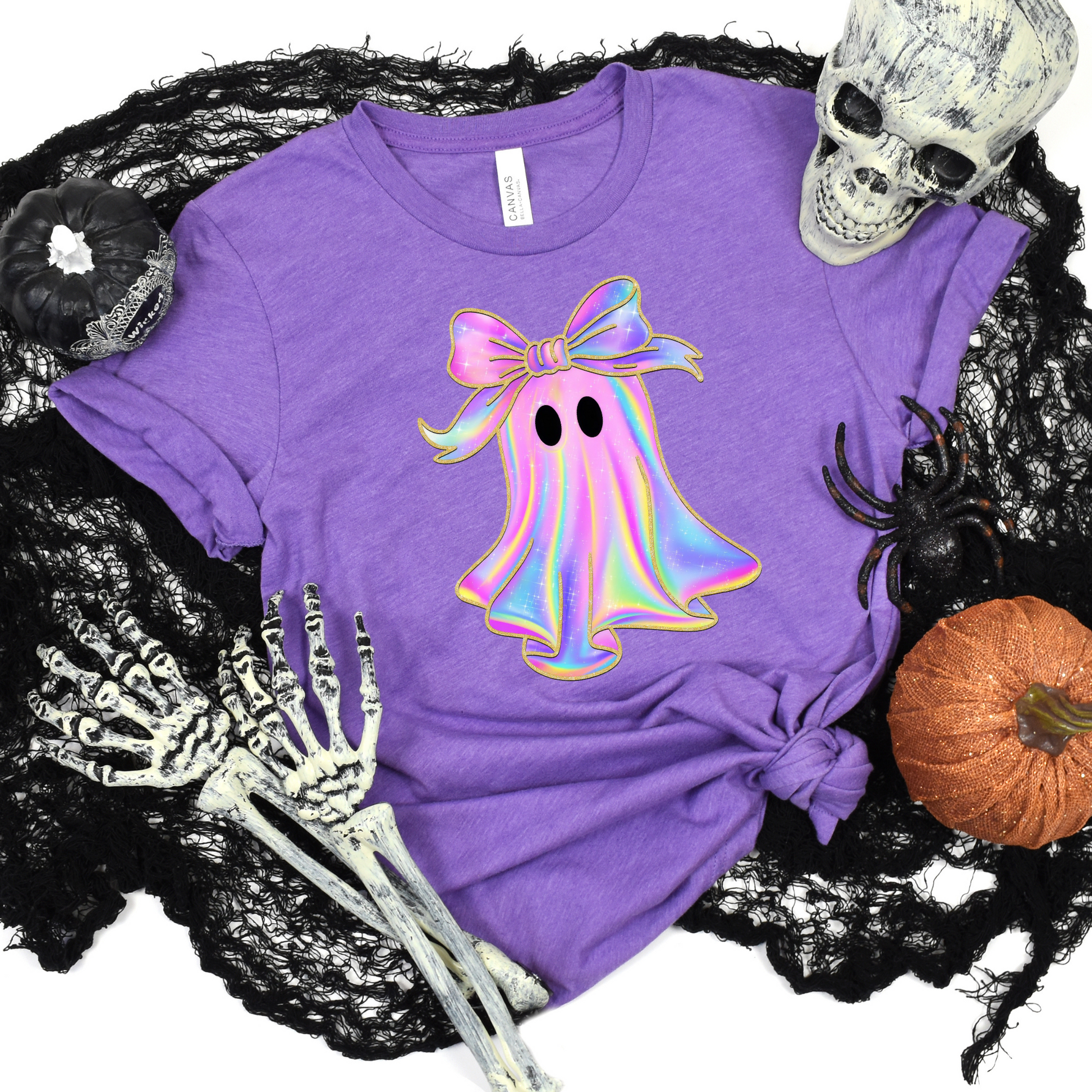 Add some sparkle to your spooky season with our pastel holographic ghost tee! Featuring an adorable ghost with a big bow, this soft and comfy shirt is perfect for anyone who loves their Halloween cute with a touch of glam.