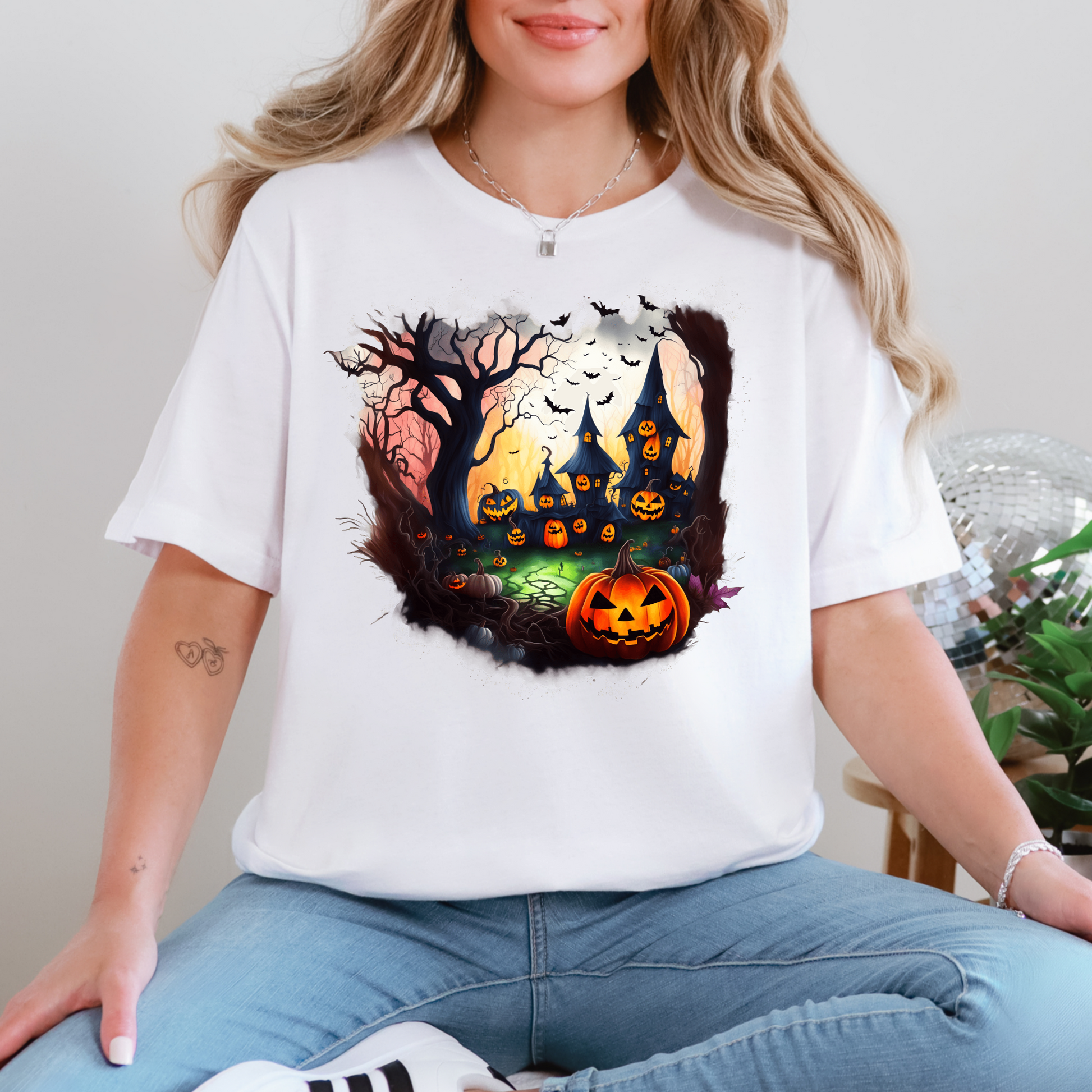 Step into spooky season with this vibrant Halloween graphic tee! Featuring glowing jack-o’-lanterns, bats, and a haunted house scene, this shirt is perfect for anyone who loves festive vibes with a touch of fright. Made with soft, comfy fabric for a casual yet fun October look.