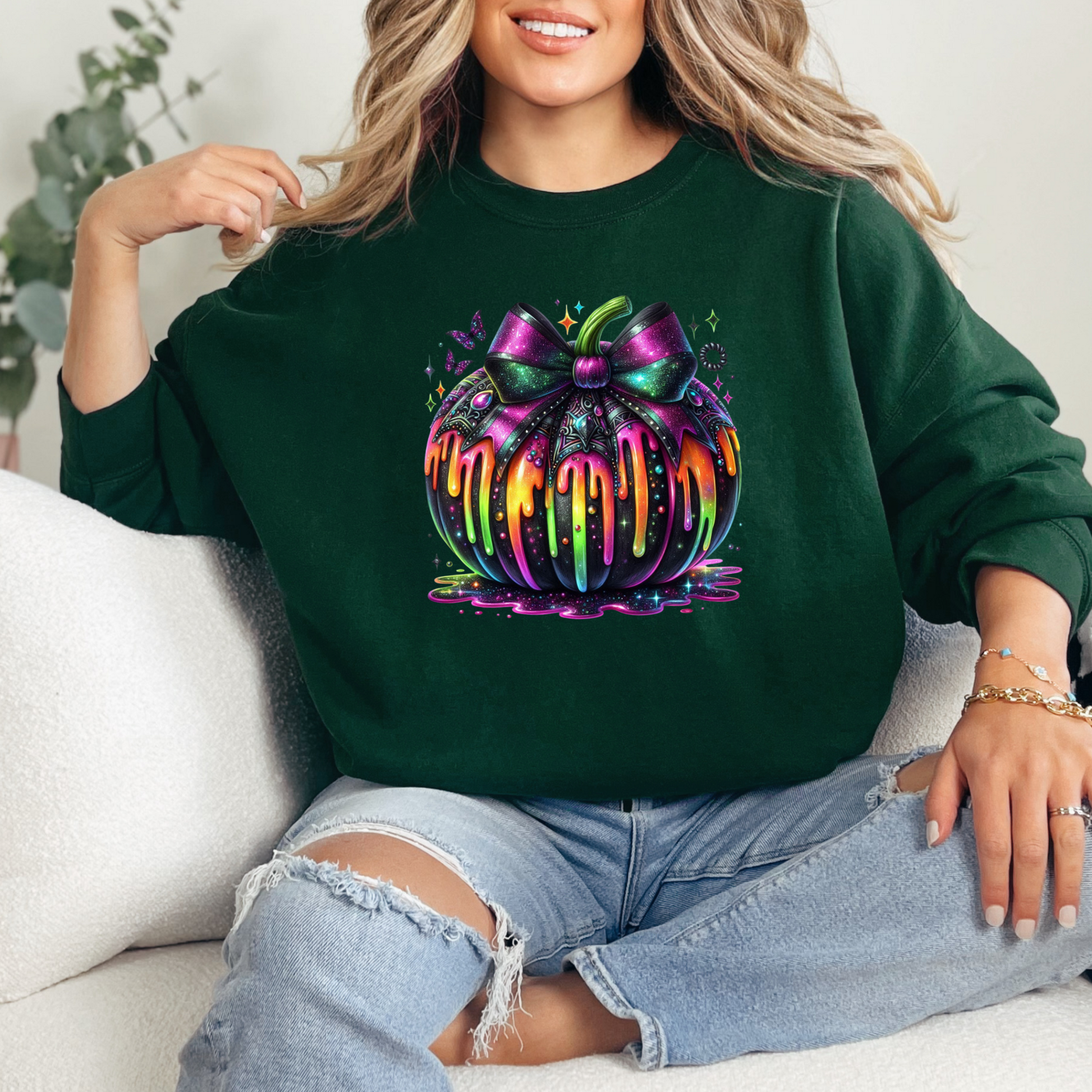 Cozy up in bold autumn style with this Rainbow Drip Pumpkin Sweatshirt. Featuring a vibrant neon pumpkin with a dripping rainbow design and a sparkling bow, this pullover brings a fun twist to classic fall fashion. Perfect for Halloween parties, pumpkin patch trips, or just adding a pop of color to your seasonal wardrobe.