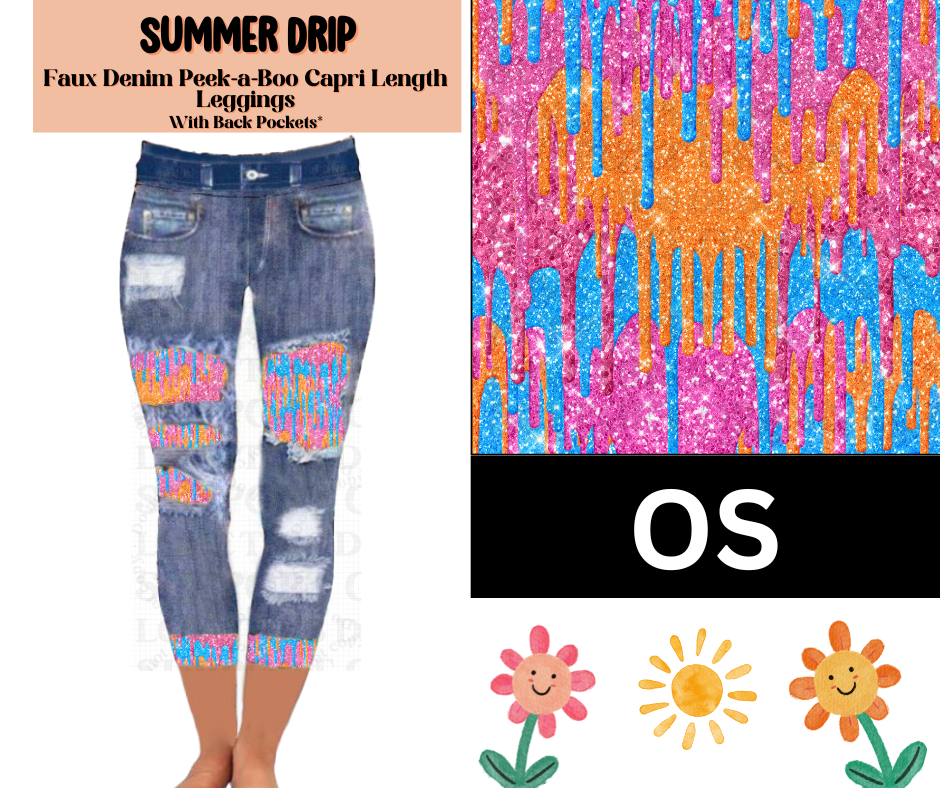 Capri Length Leggings in a Faux Denim Peekaboo design. Functional back pockets.